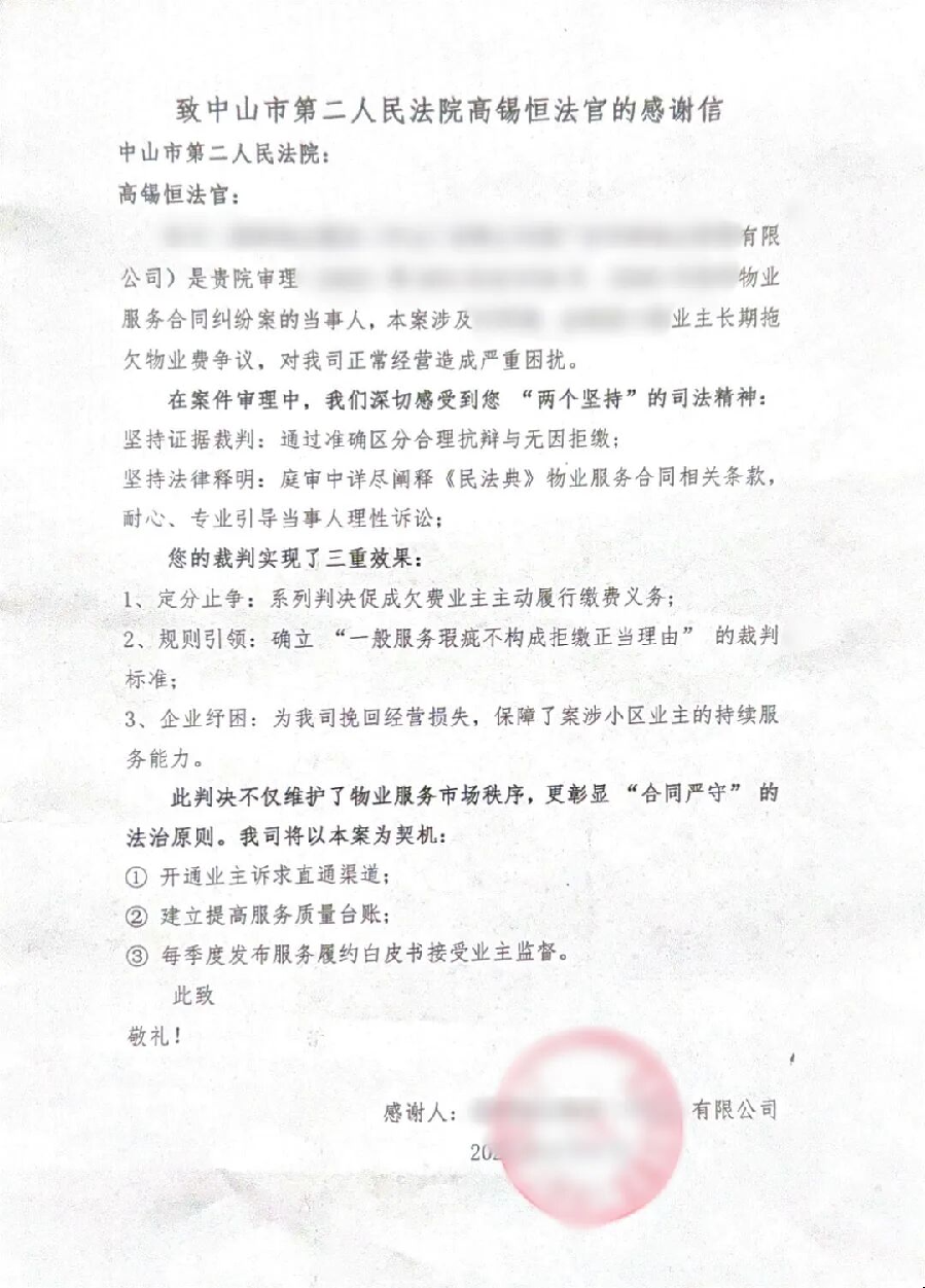 九月的廣東,秋意漸濃,暑熱未消。在這樣一個夏秋交織的時節(jié),中山市第二人民法院接連收到了當事人送來的多面錦旗。每一面錦旗的背后,都有一個有溫度的故事。 物業(yè)糾紛巧調(diào)解,找準最優(yōu)解 “感謝法官的高效調(diào)解,為我們公司排憂解難,今后我們會提高服務水平,給廣大業(yè)主提供更良好的居住環(huán)境?!苯?,中山市某物業(yè)公司(化名)工作人員專程將錦旗和感謝信交到了高錫恒法官手中。