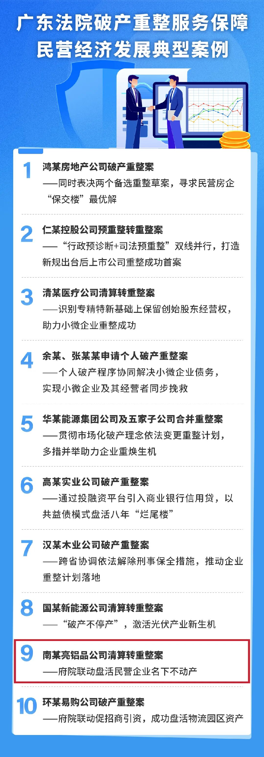 近日,廣東省高級(jí)人民法院發(fā)布一批破產(chǎn)重整服務(wù)保障民營(yíng)經(jīng)濟(jì)發(fā)展典型案例,涉及房地產(chǎn)、金融支付、醫(yī)療科技、光伏新能源、跨境電商等多個(gè)行業(yè),重整對(duì)象既有上市公司和大型企業(yè)集團(tuán),又有中小微企業(yè)和個(gè)人。2023年以來(lái),廣東法院充分發(fā)揮破產(chǎn)重整拯救功能,助力廣田集團(tuán)等10余家上市公司“摘星”“脫帽”、243家企業(yè)重整再生,幫助穩(wěn)住就業(yè)崗位5萬(wàn)余個(gè),安置職工6萬(wàn)余人,盤(pán)活存量資產(chǎn)783億元,釋放土地資源4000萬(wàn)平方米。 近年來(lái),廣東法院強(qiáng)化破產(chǎn)重整拯救功能,精準(zhǔn)助力困境民營(yíng)企業(yè)化解債務(wù)危機(jī)、盤(pán)活核心資產(chǎn)、成功轉(zhuǎn)型升級(jí),努力保民生保穩(wěn)定、優(yōu)化營(yíng)商環(huán)境,破產(chǎn)案件平均審理時(shí)間縮短至10個(gè)月,破產(chǎn)成本下降超20%,為廣東民營(yíng)經(jīng)濟(jì)高質(zhì)量發(fā)展提供了堅(jiān)實(shí)的司法服務(wù)和保障。 其中,中山市中級(jí)人民法院審理的“南某亮鋁品公司清算轉(zhuǎn)重整案”入選。