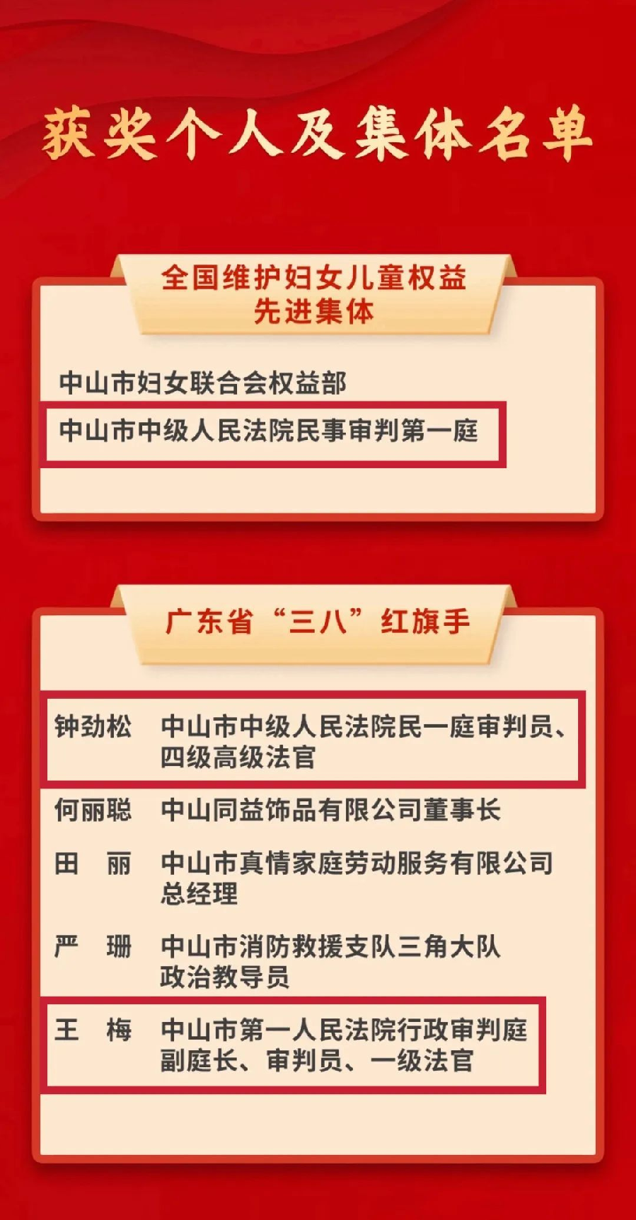 2023年度全國維護(hù)婦女兒童權(quán)益先進(jìn)集體: 中山市中級人民法院民事審判第一庭 牛慶利庭長介紹,中山中院作為最高法院首批家事審判改革試點(diǎn)法院,民一庭作為主責(zé)內(nèi)設(shè)機(jī)構(gòu),以依法保護(hù)未成年人、婦女、老人合法權(quán)益”為宗旨,以培育良好家風(fēng)、增進(jìn)家庭和睦、促進(jìn)社會和諧為改革目標(biāo),持續(xù)為全省、全國貢獻(xiàn)家事審判“中山經(jīng)驗”,并著力打造出婚姻家庭矛盾化解領(lǐng)域的新時代“楓橋經(jīng)驗”。推動全市15個部門建立多元化解家事糾紛機(jī)制,全面建立案后回訪和幫扶制度、反家庭暴力庇護(hù)對接機(jī)制、困境未成年人救助保護(hù)機(jī)制、法律援助及司法救助機(jī)制,婚姻家庭矛盾調(diào)解率連續(xù)五年達(dá)80%以上。