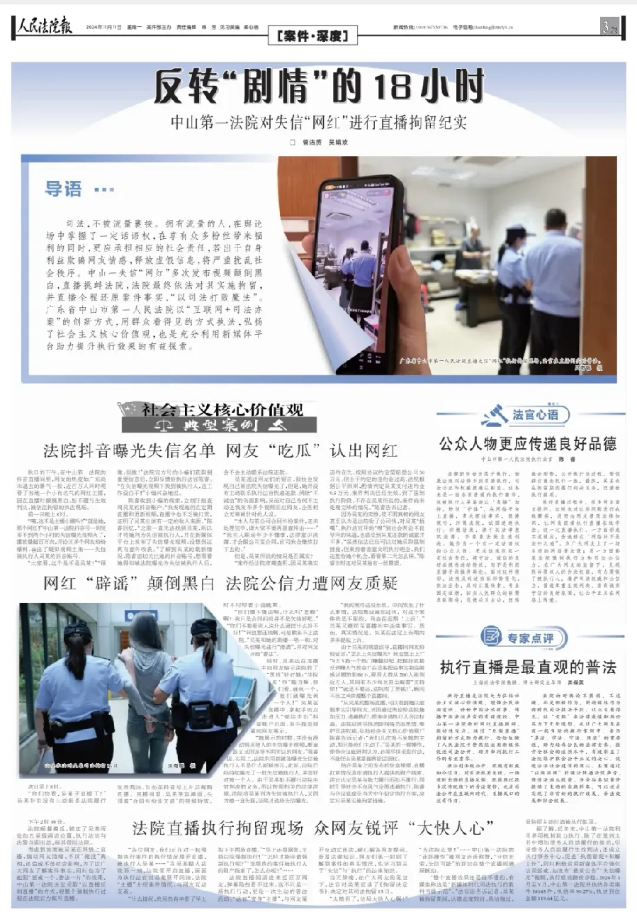 11月11日,《人民法院報》第三版以“反轉(zhuǎn)‘劇情’的十八小時”為題,整版深入報道了市第一法院以“互聯(lián)網(wǎng)+司法辦案”的創(chuàng)新方式對失信“網(wǎng)紅”進行直播拘留,成功執(zhí)結(jié)一起合同糾紛案件,收獲廣大網(wǎng)友點贊的經(jīng)典案例。