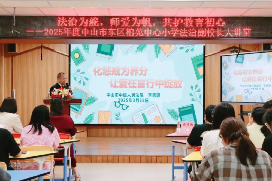 三月的風掠過法徽,捎來木棉的絮語,中山兩級法院的法官們褪下法袍、走出法庭,將一堂堂生動的法治課搬進了書香氤氳的校園。 市中級法院 在東區(qū)柏苑中心小學,中山市中級人民法院審判監(jiān)督庭庭長李勇源法官作為法治副校長為學校全體教師開講“法治為舵,師愛為帆,共護教育初心”的專題法律講座,李法官強調(diào),在孩子成長的畫卷上,愛始終是不變的底色,懲戒既要畫出邊界的線條,也留出綻放的空白,孩子才能身心健康成長。