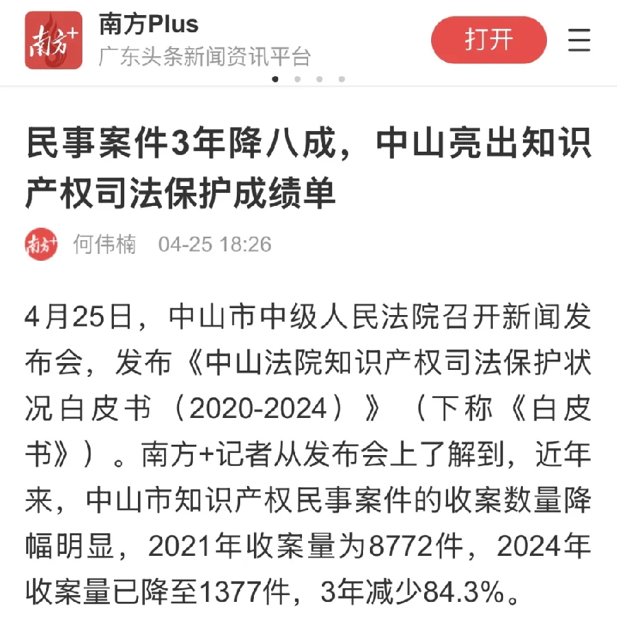 近年來(lái),中山市知識(shí)產(chǎn)權(quán)民事案件的收案數(shù)量降幅明顯,2021年收案量為8772件,2024年收案量已降至1377件,3年減少84.3%。 【南方都市報(bào)】