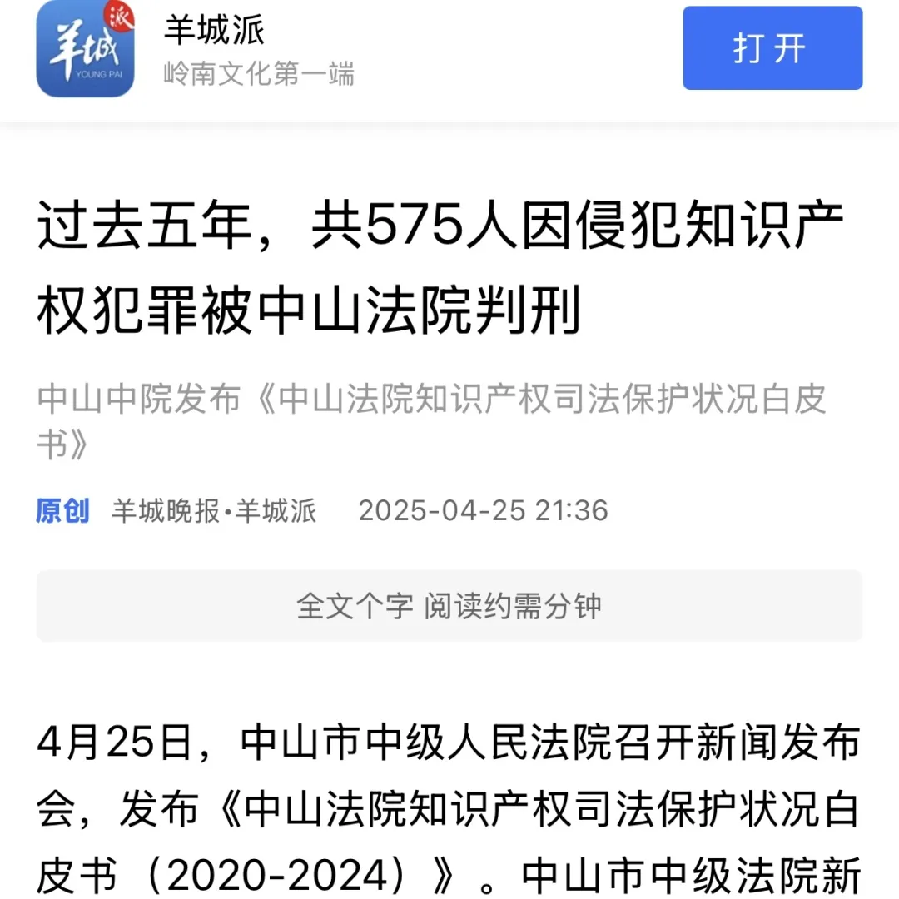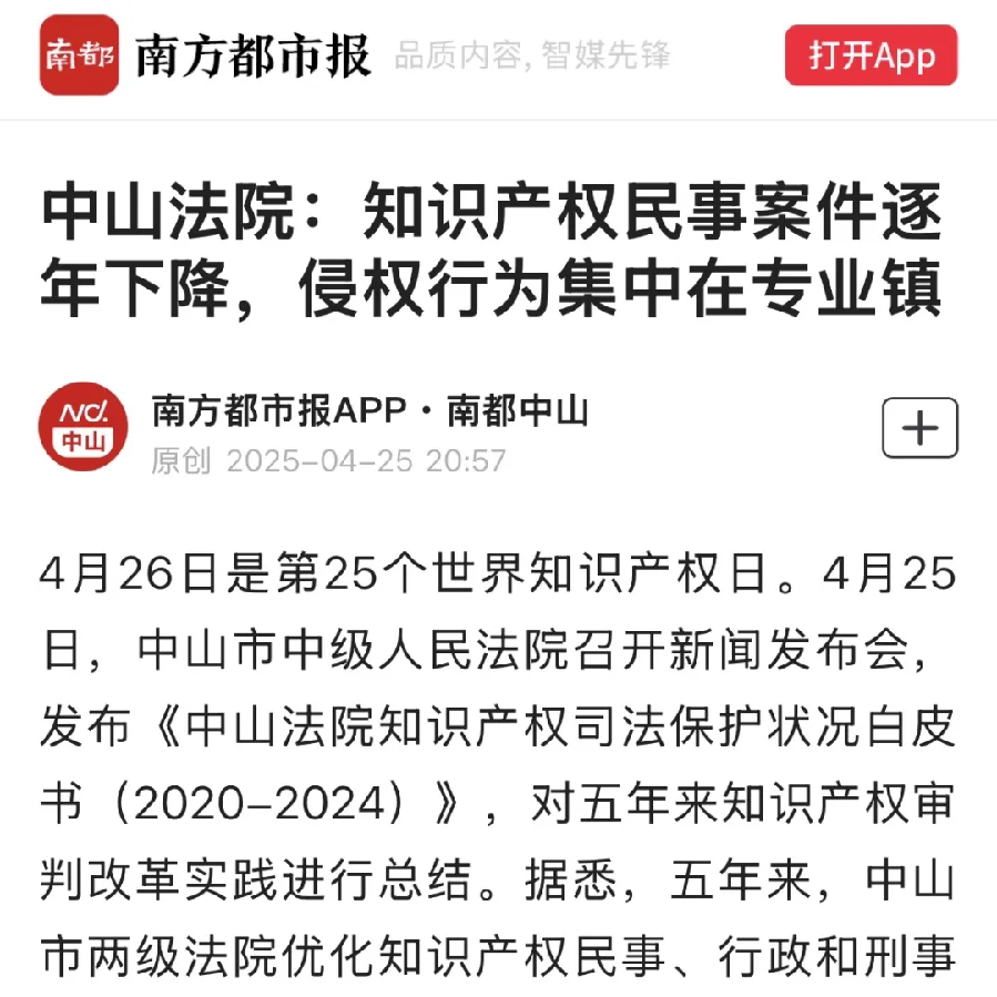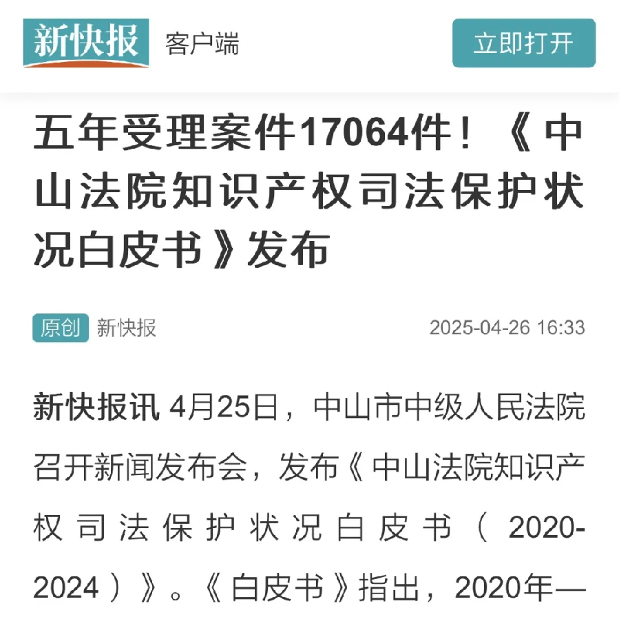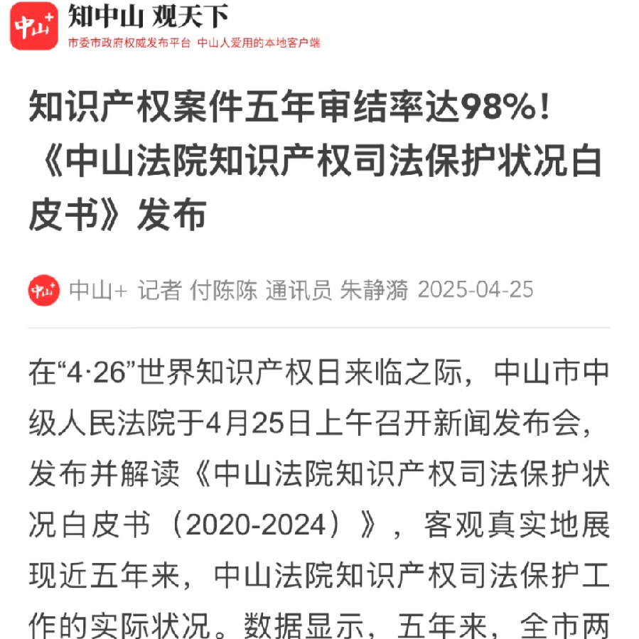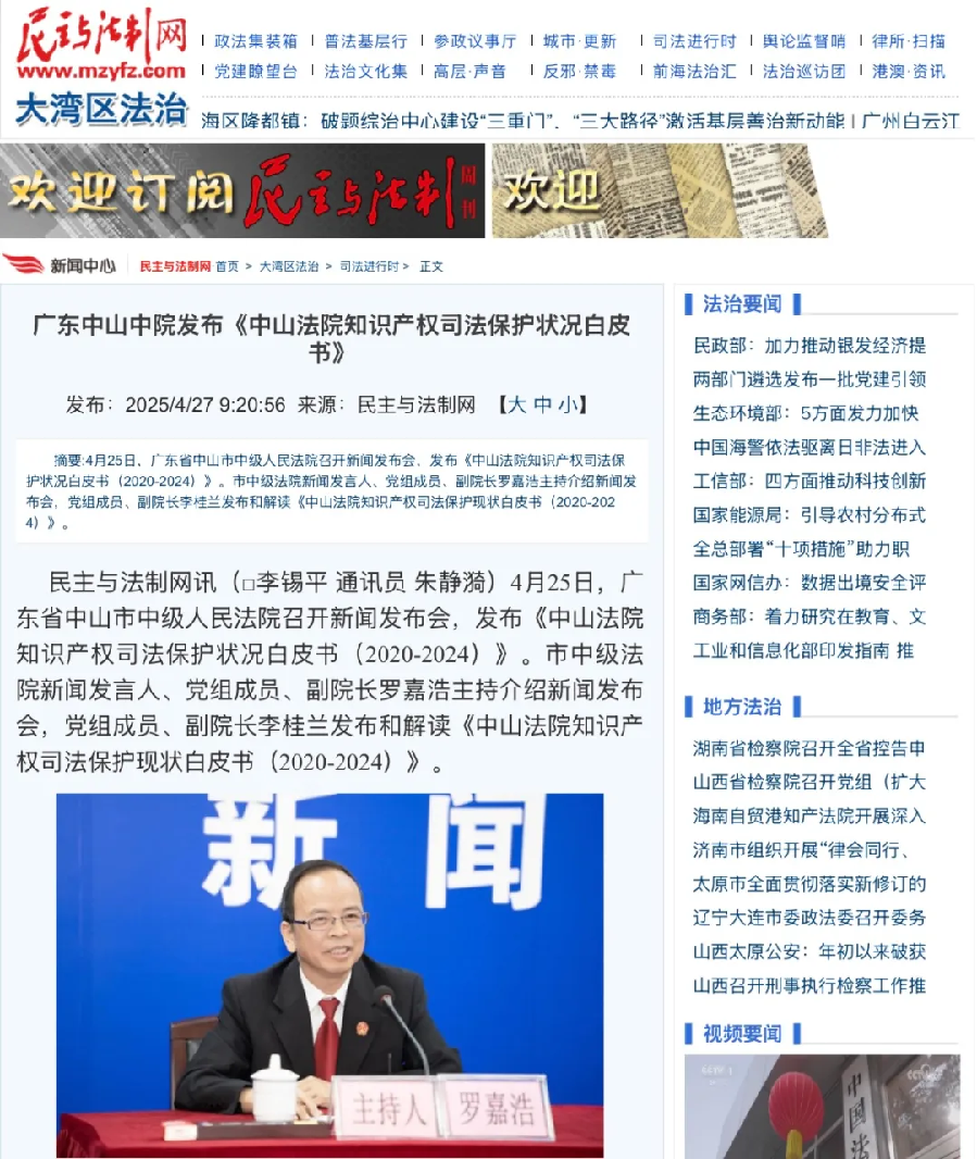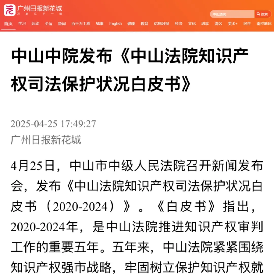 在第25個(gè)“世界知識(shí)產(chǎn)權(quán)日”到來(lái)之際,4月25日,中山市中級(jí)人民法院召開(kāi)了新聞發(fā)布會(huì),發(fā)布《中山法院知識(shí)產(chǎn)權(quán)司法保護(hù)狀況白皮書(shū)(2020-2024)》。五年來(lái),中山法院知識(shí)產(chǎn)權(quán)審判取得了哪些成績(jī)?媒體進(jìn)行了聚焦報(bào)道。 【南方日?qǐng)?bào)】