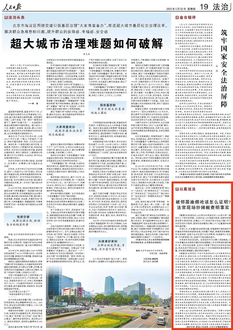 編者按 民法典頒布五年來,1260個條文在千萬起司法案件中轉(zhuǎn)化為公平正義的生動實(shí)踐,更通過潛移默化的普法教育形塑著全社會的價值理念與規(guī)則意識。五周年之際,最高人民法院官微開設(shè)“‘典’亮美好生活”專欄,最新一期推出人民日報昨日刊發(fā)的廣州中院審理案件《被鄰居油煙嗆該怎么證明?法官現(xiàn)場炒辣椒查明事實(shí)》。