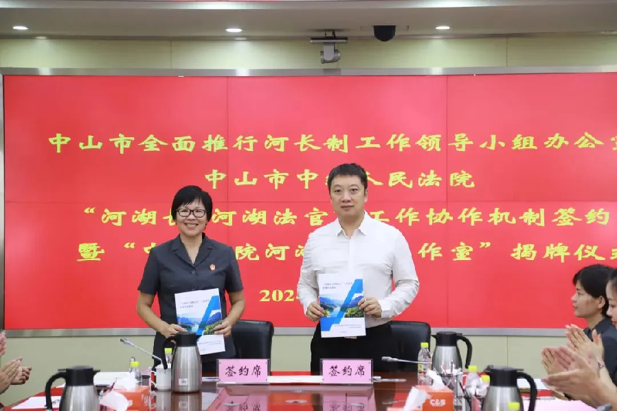 ▲中山市中級(jí)人民法院與中山市河長(zhǎng)辦舉行《“河湖長(zhǎng)+河湖法官”工作協(xié)作機(jī)制共建協(xié)議》簽約暨“中山法院河湖法官工作室”揭牌儀式。 四是加強(qiáng)涉水污染行政審判工作,規(guī)范和促進(jìn)水污染行政執(zhí)法。2022年以來,中山法院環(huán)資審判部門先后派出法官為生態(tài)環(huán)境局及其二級(jí)執(zhí)法、技術(shù)機(jī)構(gòu)宣講訴訟證據(jù)制度,觀摩指導(dǎo)生態(tài)環(huán)境局下屬檢測(cè)流程,邀請(qǐng)行政執(zhí)法機(jī)構(gòu)旁聽環(huán)資案件庭審,提高中山涉水環(huán)境行政執(zhí)法、行政審判能力。 五是加強(qiáng)司法建議,得到被建議單位的肯定和積極回應(yīng)。中山中院向中山市生態(tài)環(huán)境局發(fā)出《關(guān)于規(guī)范生態(tài)環(huán)境損害賠償鑒定的司法建議書》,大幅減少事務(wù)性費(fèi)用,促進(jìn)賠償義務(wù)人自愿磋商,達(dá)成賠償協(xié)議。市第一法院向市生態(tài)環(huán)境局發(fā)出《關(guān)于河涌污染案件辦理的司法建議書》,促進(jìn)我市有針對(duì)性地加大行政執(zhí)法力度,有效防控重金屬嚴(yán)重超標(biāo)工業(yè)廢水污染河涌。 六是加強(qiáng)水污染違法犯罪警示教育宣傳。充分利用世界水日、世界環(huán)境日等節(jié)日,廣泛開展法治宣傳。如市第一法院與最高人民法院、團(tuán)市委、市水務(wù)局等聯(lián)動(dòng)在第二個(gè)全國(guó)生態(tài)日開展