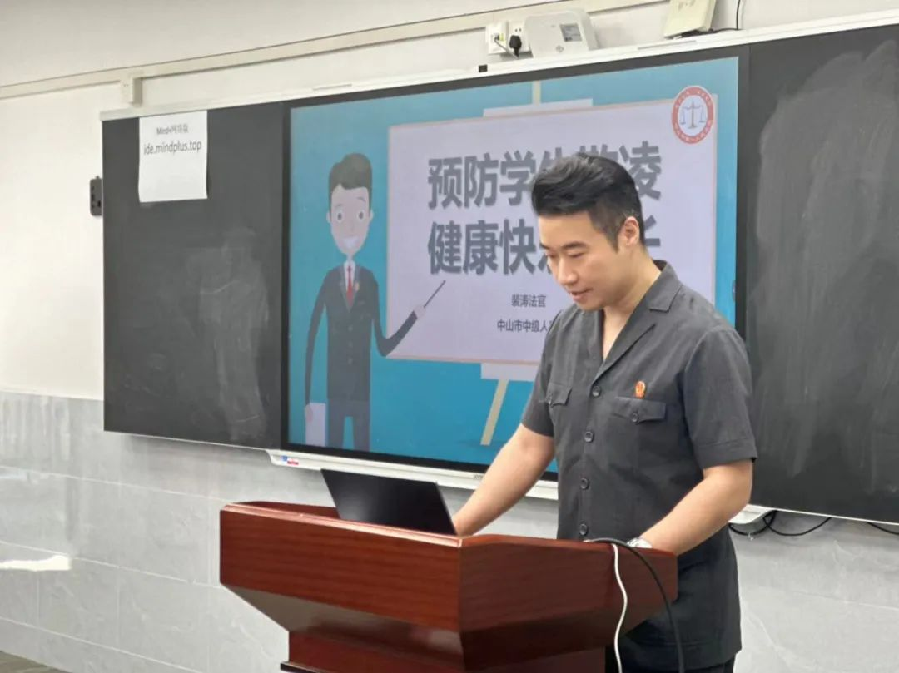 (真實(shí)庭審中的裴濤法官) 脫下法袍,裴濤法官的身影同樣活躍在普法教育的前沿。作為中山市水云軒小學(xué)的法治副校長(zhǎng),他積極深入校園,用真實(shí)生動(dòng)的案例和深入淺出的講解,為莘莘學(xué)子們帶去精彩的法治課堂。他將復(fù)雜的法律條文轉(zhuǎn)化為孩子們能理解的道理,他認(rèn)為,“法槌不僅要敲在法庭上,更要敲進(jìn)下一代的心坎里”,以實(shí)際行動(dòng)播撒法治的種子。