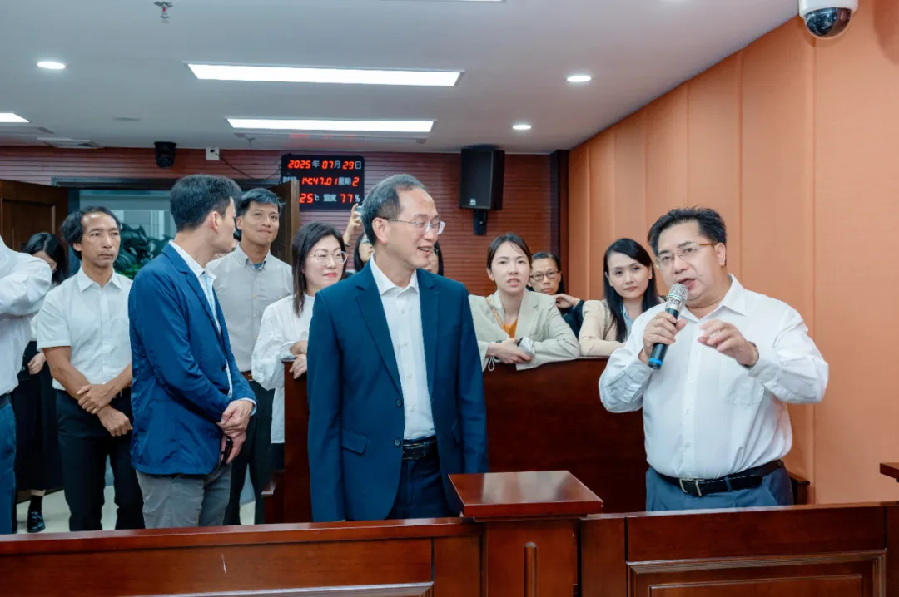 ▲在中山法院訴訟服務(wù)中心合影 國家法官學(xué)院院長、最高人民法院司法案例研究院院長李成玉,澳門法律及司法培訓(xùn)中心主任高炳坤,澳門特區(qū)終審法院書記長梁楚紅,廣東省高級人民法院副院長李克儉,中山市中級人民法院院長廖萬春出席活動。