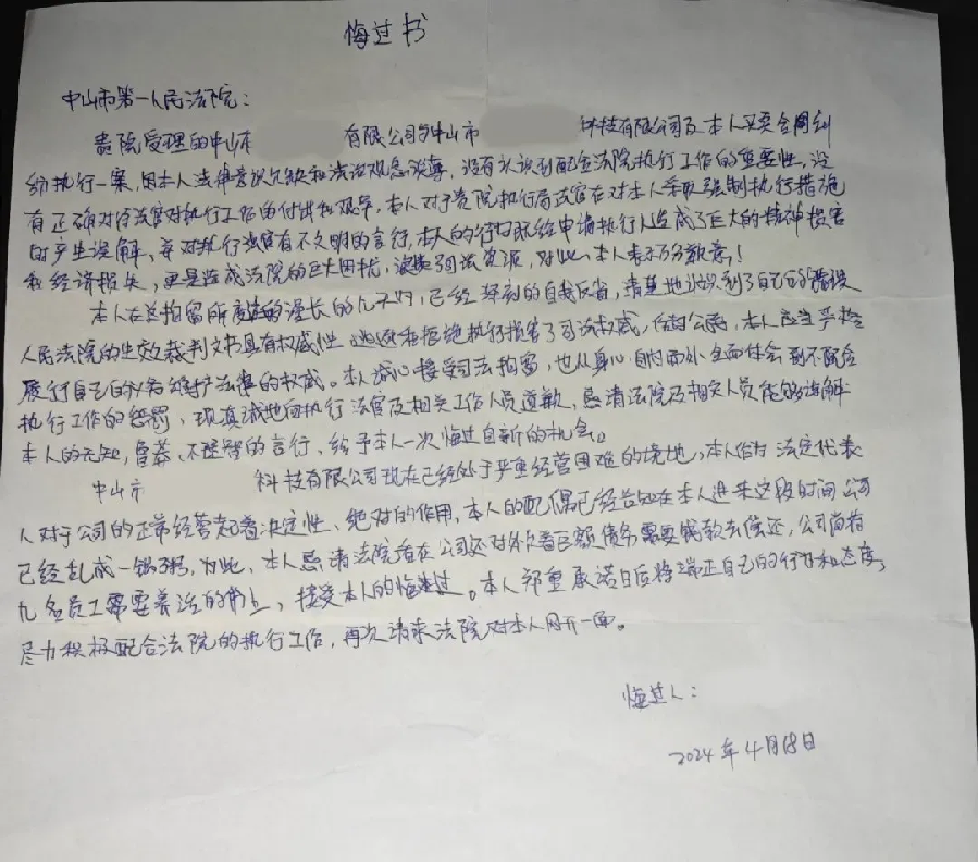 由于廠里還有數(shù)名員工,考慮到直接拘留會引起仍在工作的員工焦躁恐慌,執(zhí)行干警并沒有采取現(xiàn)場拘留的措施,而是要求劉某到法院進一步說明情況。 來到法院后,執(zhí)行法官耐心對劉某釋法說理,但劉某仍然沒有一點和談的誠意,堅持聲稱自己沒有還款能力,甚至質(zhì)疑法院的文書。在多次勸說無果后,為震懾拒不履行義務(wù)的被執(zhí)行人,高麗法官果斷決定對其采取司法拘留措施。 法警為劉某戴上手銬并通知其家屬后,劉某開始慌了,表示愿意籌錢還款。同時接到通知的劉某家屬也開始籌錢,并在送拘后的3個小時內(nèi),劉某家屬向申請人還清全部欠款。 “我已意識到自己的錯誤,司法權(quán)威不可挑戰(zhàn),我會全力配合法院工作……”劉某在看守所內(nèi)寫下了悔過書。