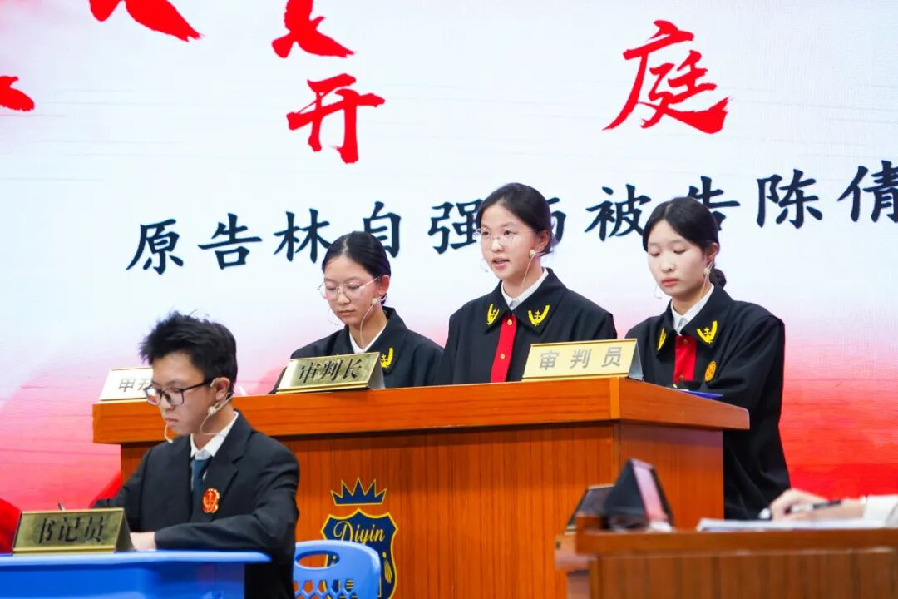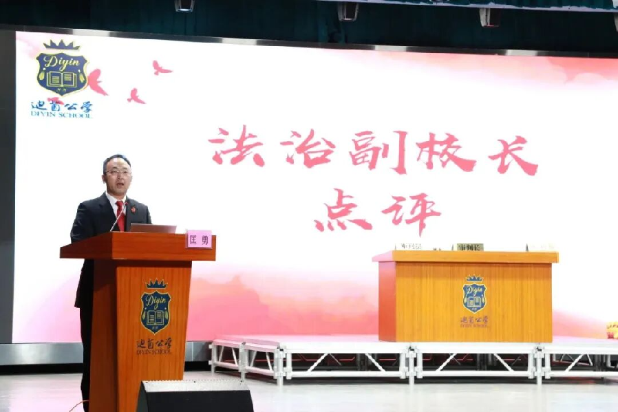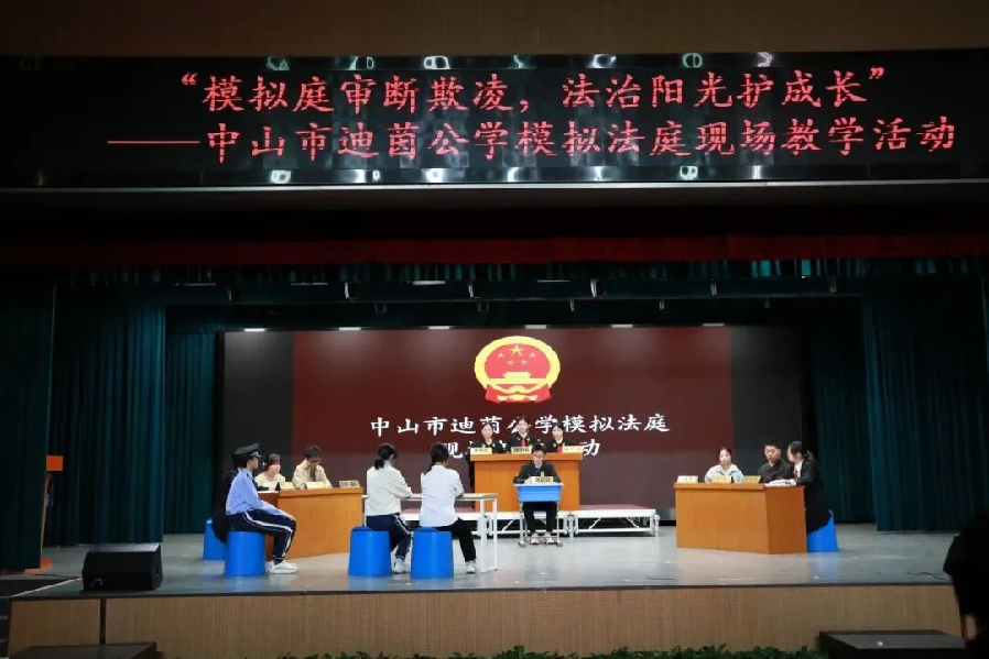 在迪茵公學(xué)的模擬法庭活動(dòng)中,學(xué)生們通過演繹學(xué)生欺凌案例,親身體驗(yàn)庭審程序。 中山市第一人民法院行政庭庭長(zhǎng)、學(xué)校法治副校長(zhǎng)匡勇在點(diǎn)評(píng)中結(jié)合粵港澳三地法律實(shí)踐,強(qiáng)調(diào)“法治是灣區(qū)青年的共同語(yǔ)言”,并為學(xué)生贈(zèng)送憲法讀本,鼓勵(lì)他們成為法治文化的傳播者。