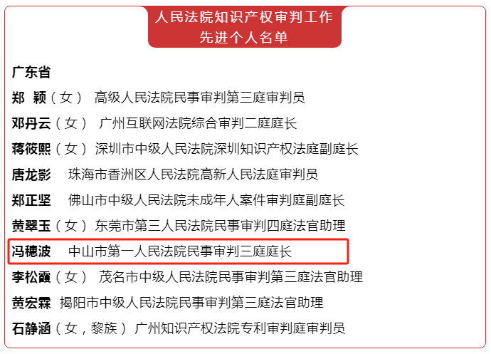 馮穗波是市第一人民法院民三庭庭長,先后榮立個(gè)人三等功2次,個(gè)人嘉獎(jiǎng)3次,2022年被授予“全市審判業(yè)務(wù)專家”稱號。他深耕知識產(chǎn)權(quán)審判工作15年,專業(yè)理論功底扎實(shí),承辦多起重大疑難復(fù)雜的知識產(chǎn)權(quán)案件。主審案件曾入選2012年度廣東省年度知識產(chǎn)權(quán)保護(hù)十大案例、2017-2018年度知識產(chǎn)權(quán)保護(hù)十佳案例、廣東法院第二批粵港澳大灣區(qū)跨境糾紛典型案例等。近五年來,馮穗波審結(jié)各類知識產(chǎn)權(quán)案件1599件,案件調(diào)撤率近30%。