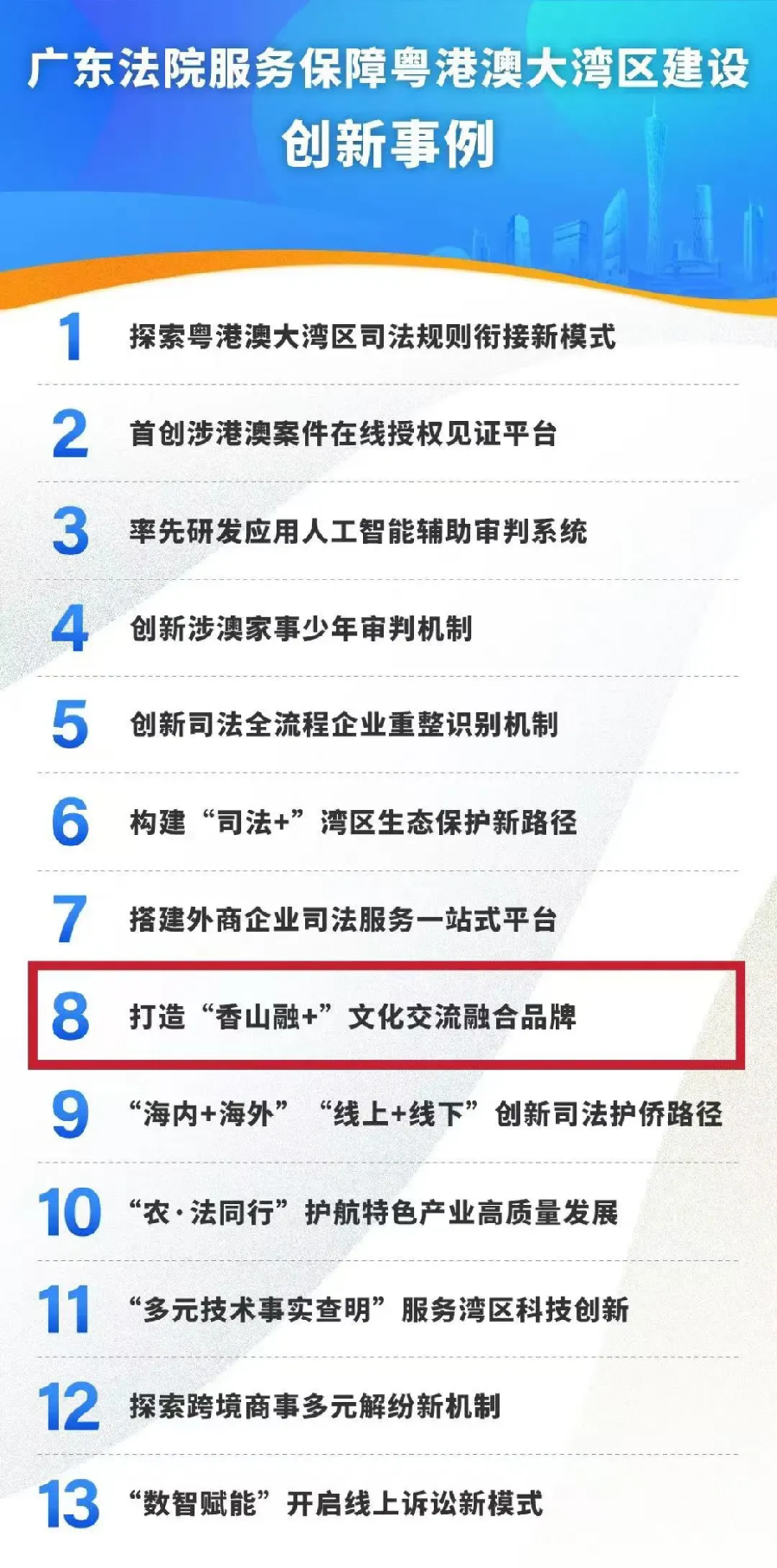 近日,廣東省高級(jí)人民法院發(fā)布13個(gè)服務(wù)保障粵港澳大灣區(qū)建設(shè)創(chuàng)新事例,涉及司法規(guī)則銜接、構(gòu)建線上訴訟新模式、跨境訴訟授權(quán)見(jiàn)證、外商企業(yè)司法服務(wù)一站通辦、多元技術(shù)事實(shí)查明機(jī)制、跨境商事多元解紛、灣區(qū)生態(tài)保護(hù)等多個(gè)領(lǐng)域,集中展現(xiàn)了廣東法院深入貫徹習(xí)近平法治思想,堅(jiān)持“公正與效率”工作主題,緊扣省委“1310”具體部署,以高質(zhì)量司法服務(wù)保障粵港澳大灣區(qū)建設(shè)向縱深推進(jìn)的司法新作為。 其中,中山法院“打造‘香山融+’文化交流融合品牌”創(chuàng)新事例入選其中。