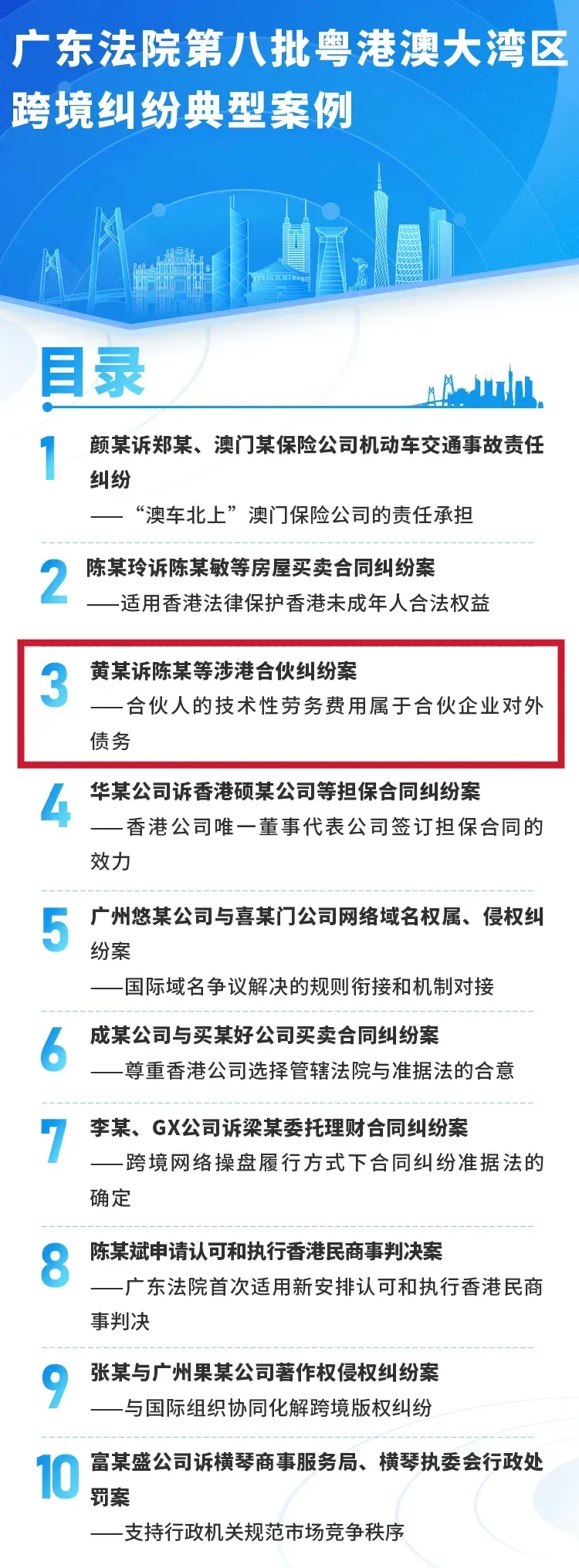 近日,廣東省高級人民法院發(fā)布第八批粵港澳大灣區(qū)跨境糾紛典型案例,這批案例涉及域外法查明、內(nèi)地法院依據(jù)新安排認(rèn)可和執(zhí)行香港法院民商事判決、香港公司選擇內(nèi)地法院管轄并適用內(nèi)地法律解決糾紛、“澳車北上”保險(xiǎn)責(zé)任承擔(dān)、網(wǎng)絡(luò)域名權(quán)屬等熱點(diǎn)與前沿問題,體現(xiàn)了廣東法院充分發(fā)揮審判職能,全面加強(qiáng)三地訴訟規(guī)則銜接,全力打造跨境糾紛化解優(yōu)選地,為粵港澳大灣區(qū)高質(zhì)量發(fā)展提供有力司法保障的生動(dòng)實(shí)踐。 這十個(gè)典型案例包括交通事故責(zé)任糾紛、房屋買賣合同糾紛、擔(dān)保合同糾紛、著作權(quán)糾紛等多種類型。其中,中山法院審理的黃某訴陳某等涉港合伙糾紛案——合伙人的技術(shù)性勞務(wù)費(fèi)用屬于合伙企業(yè)對外債務(wù)一案入選,在黃某訴陳某等涉港合伙糾紛案中,內(nèi)地法院依法認(rèn)定香港合伙人的技術(shù)性勞務(wù)費(fèi)用屬于合伙企業(yè)債務(wù),保護(hù)港澳投資者在內(nèi)地的投資權(quán)益,營造粵港澳大灣區(qū)法治化營商環(huán)境。 據(jù)了解,廣東法院去年共審結(jié)一審涉港澳民商事案件1.35萬件,約占全國的三分之二。自2019年12月至今,已陸續(xù)發(fā)布粵港澳大灣區(qū)跨境糾紛典型案例8批120個(gè),發(fā)揮案例在統(tǒng)一裁判尺度、提供規(guī)則指引、加強(qiáng)法治宣傳等方面的重要作用,以司法之力護(hù)航大灣區(qū)行穩(wěn)致遠(yuǎn)。